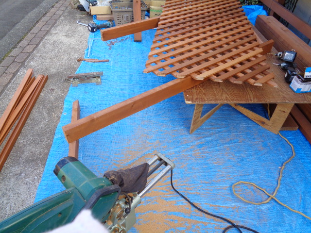 :屋外木製手摺と目隠しフェンス:(工事費 解体撤去+米杉(ウエスタンレッドシダー材)+保護塗料塗布+ステンレス金具類各種+施工費+廃棄処分費など 約¥94万)